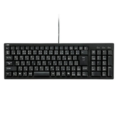 <仕様>■カラー:ブラック■キー表示:日本語■キー数:103キー■キーピッチ:19mm■インターフェース(コネクタ):USB(Aタイプコネクタ)、PS/2コンボタイプ(ミニDIN 6pinオス)■キースイッチ:メンブレン■キーストローク:3.8±0.3mm■動作力:55±10g■消費電流:100mA以下■サイズ:W391.1×D129.1×H27.5mm■重量:460g■ケーブル長:1.5m■対応機種:Windows搭載(DOS/V)パソコン※ただし、USBポートを持ちパソコン本体メーカーUSBポートの動作を保証している機種、もしくはPS/2キーボードポートを持ち、本体メーカーがPS/2ポートの動作を保証している機種。